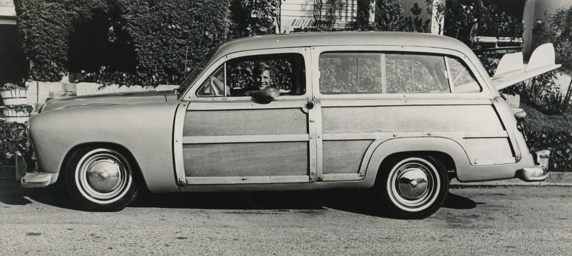 The teenager’s entry into surfing was eased by his friend, Denny Aaberg, who lived next to Palisades Park. Kemp, the oldest Aaberg brother, was a lifeguard at Malibu who gained a modicum of surf stardom when a photograph of him arching across a sparkling Rincon wall became Surfer Magazine’s first logo (he was also one of the featured surfers in Bruce Brown’s 1958 film Slippery When Wet): “We all looked up to Kemp because he was a lifeguard and a great surfer. He and his good friend, Lance Carson, were the two best surfers in Pacific Palisades. He drove this funky car that always had surfboards sticking out of the back. ”