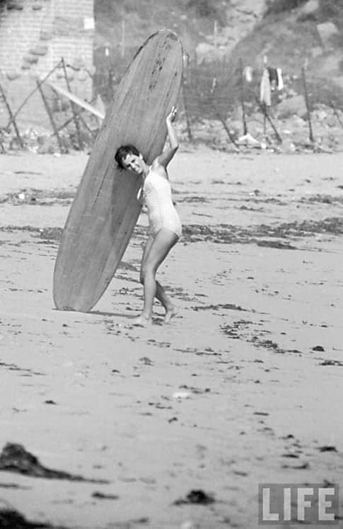The film Gidget came out in the spring of 1959, and Jim Ganzer and Denny Aaberg saw it on opening night at the Bay Theatre in Pacific Palisades. “There was a big line out front, cars were cruising by honking their horns, guys doing BAs out the window, it was a big scene. We go to the ticket booth and a small, cute brunette, a little older than us, handed us our tickets. Denny said, ‘Thanks, Gidge.’ We got out of ear shot and Denny turned to me and said, ‘That’s her, that’s the real Gidget.’” Kathy Kohner Zuckerberg, the daughter of German émigré screenwriter Frederick Kohner, grew up in the Palisades and learned to surf at Malibu. She told her father about the characters she met at Malibu and all the dramas she witnessed. “He wove them into the book Gidget that was a huge hit when it came out in 1957, but when the movie came out in 1959, forget it, everyone wanted to become a surfer.”