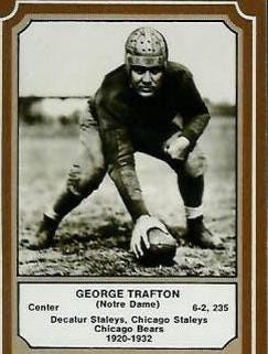 There was, however, one neighbor who was not aghast and who nobody fucked with: Mr. Trafton. NFL hall-of-famer George “The Brute” Trafton was the star center on Knute Rockney’s famous 1919 Notre Dame (“win one for the Gipper”) team, then played for and coached the Chicago Bears, and wrestled and boxed professionally. Red Grange called Trafton “the meanest, toughest, player alive.” Although he was old, “Mr. Trafton carried a big cane with a giant hook handle that he used to hook around people’s necks and pull them close for a little chat.”